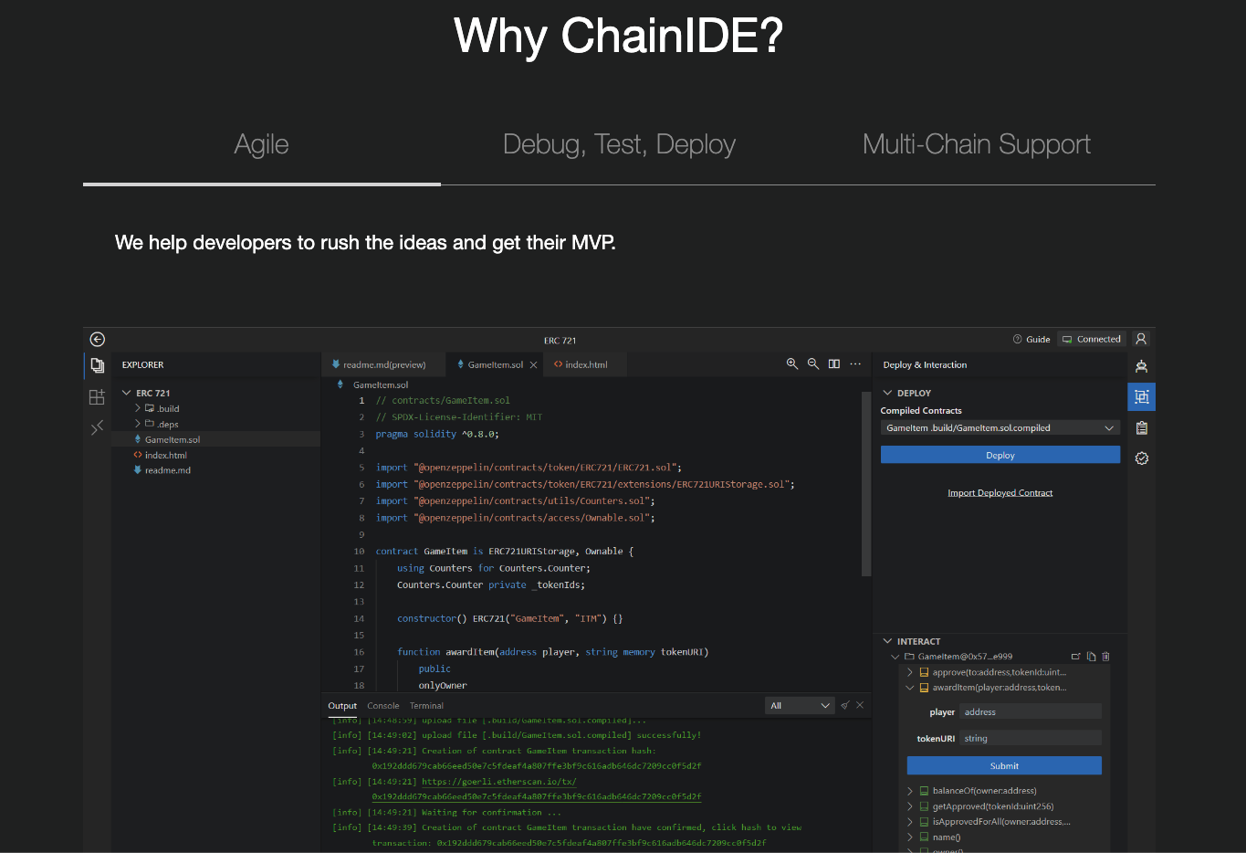 Once you create a project, you'll see ChainIDE's workspace, reminiscent of VSCode. It features a file explorer on the left, an editor on the right, and a terminal at the bottom.