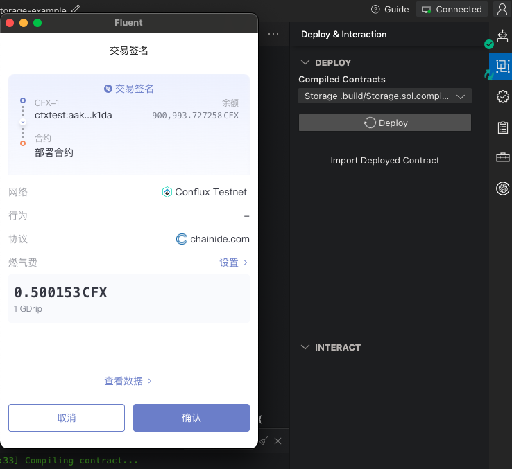 在右侧工具箱中点击部署与交互,选择一个合约,然后点击部署按钮。 随后将出现一个部署确认弹窗;点击确认。 这个操作将向 Core Space 测试网发送一笔交易,并在执行交易时部署该合约。