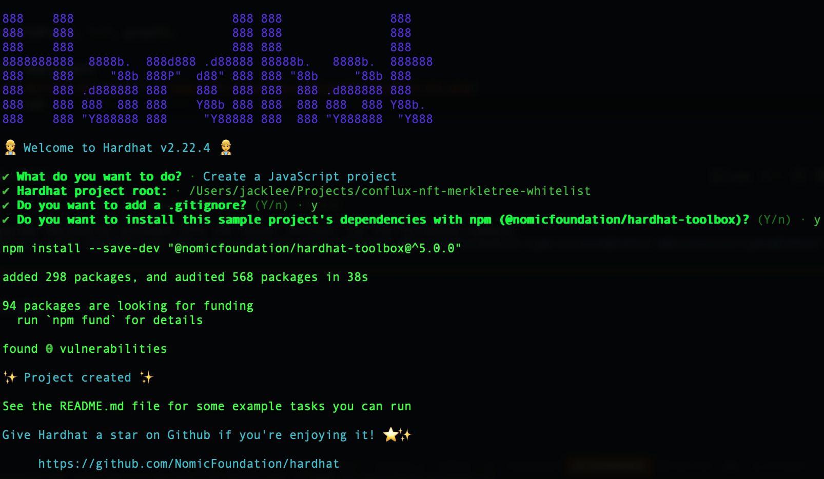 在提示时,请在所有问题上按Enter键选择默认项目设置。 这将创建一个带有所有必要配置的基本Hardhat项目设置。